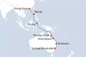 Itinerary : Sydney (Australia), Brisbane, Airlie Beach, Yorkeys Knob, Bitung, Manila, Hong Kong