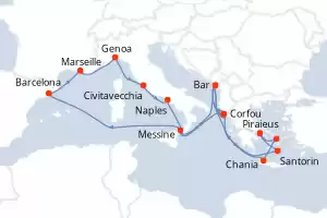 Itinerary : Civitavecchia / Rome, Naples, Chania, Kusadasi, Mykonos, Piraieus, Santorini, Bar, Corfu, Messina, Barcelona, Marseille, Ajaccio, Genoa, La Spezia, Civitavecchia / Rome