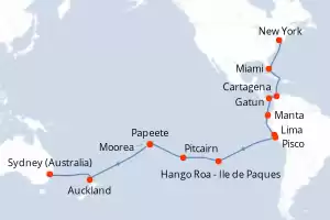 Itinerary : New York, Miami, Cartagena, Gatun, Manta, Lima, Pisco, Hango Roa - Easter island, Pitcairn, Papeete, Moorea, Auckland, Sydney (Australia)