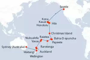 Itinerary : Seattle, Kauai, Honolulu, Hilo, Kona, Christmas Island, Papeete, Bahia D opuncha, Raiatea, Rarotonga, Vavau, Nukualofa, Waitangi, Auckland, Wellington, Sydney (Australia)