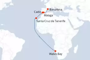 Itinerary : Barcelona, Malaga, Cadiz, Santa Cruz de Tenerife, Walvis Bay, Cape