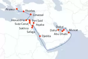Itinerary : Piraieus, Rhodes, Alexandria, Suez Canal, Sokhna, Safaga, Sharm El Sheikh, Aqaba, Djedda, Muscat, Doha, Abu Dhabi, Dubai