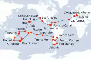 Itinerary : Buenos Aires, Puerto Madryn, Port Stanley, Ushuaia, Puerto Montt, Valparaiso, Hango Roa - Easter island, Pitcairn, Papeete, Moorea, Aitutaki, Rarotonga, Bay of Island, Auckland, Tauranga, Christchurch, DUnedin, Milford Sound, Hobart, Sydney (Australia), noumea, Luganville, Apia, Pago pago, Honolulu, Hilo, Los Angeles, Cabo San Lucas, Puntarenas, Panama Canal, Panama canal (enter), Ocho Rios, Road Town, Philippsburg, Las Palmas, Palma de Mallorca, Naples, Civitavecchia / Rome